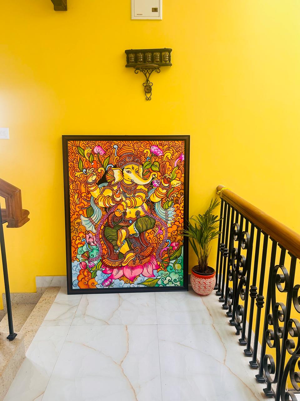 This majestic painting showcases Lord Ganesha, the revered deity, in the traditional Kerala Mural style. Towering in grandeur, Ganesha is depicted with intricate detailing and vibrant colors typical of this art form. The larger-than-life portrayal captures the divine presence of Ganesha, evoking a sense of awe and reverence. Each element of the mural, from the elaborate ornaments to the serene expression, reflects the rich cultural heritage and spiritual significance associated with Lord Ganesha in Kerala tradition.