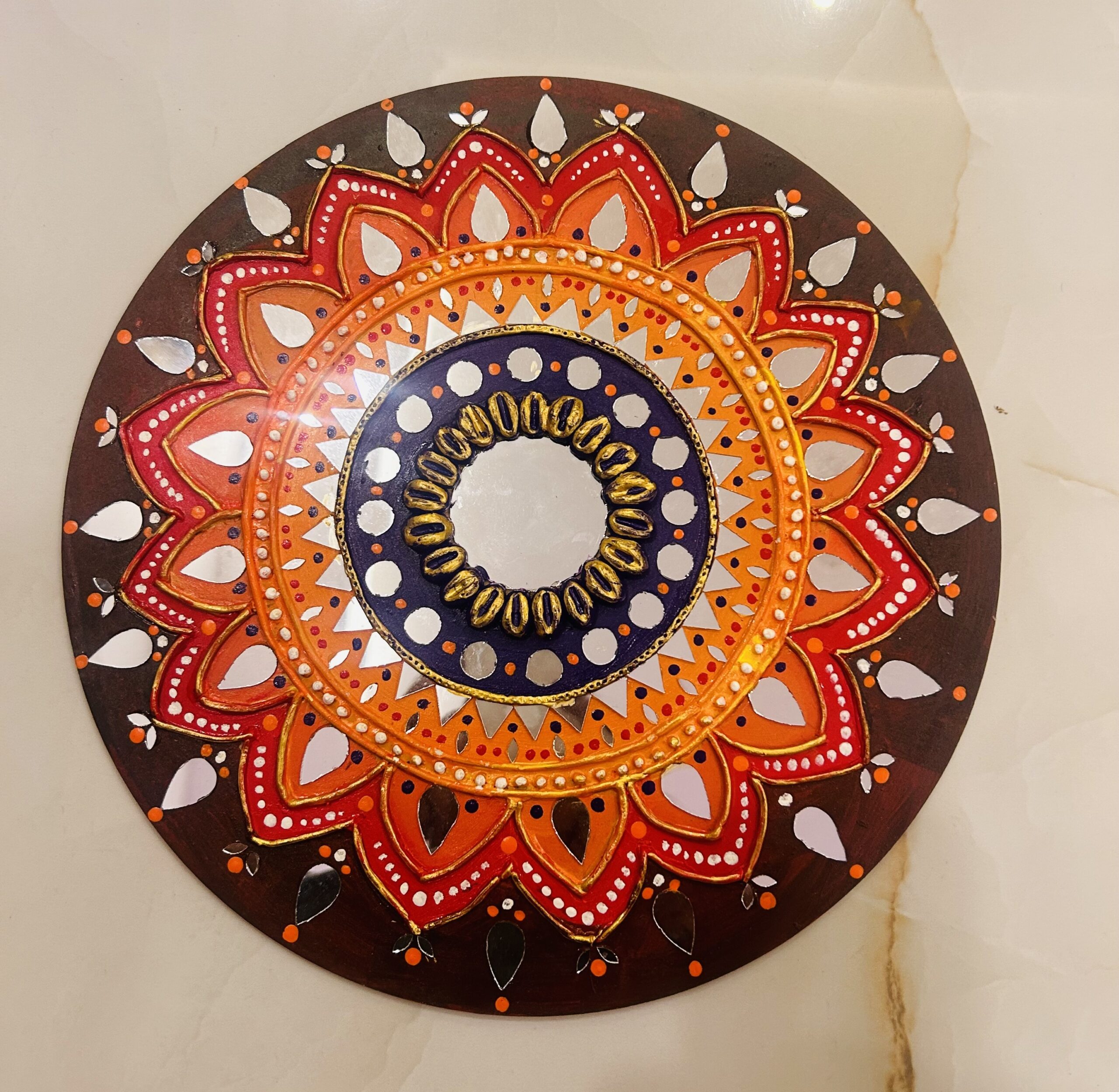 In this captivating artwork, earthy tones of brown and orange intertwine to create a mesmerizing display of Lippon artistry. Each intricate detail is enhanced with the shimmering allure of glass and the luxurious elegance of Kundan embellishments. The fusion of traditional techniques with modern elements evokes a sense of timeless beauty and sophistication. As light dances across the surface, the artwork exudes a warm radiance, inviting viewers to immerse themselves in its rich textures and vibrant hues.